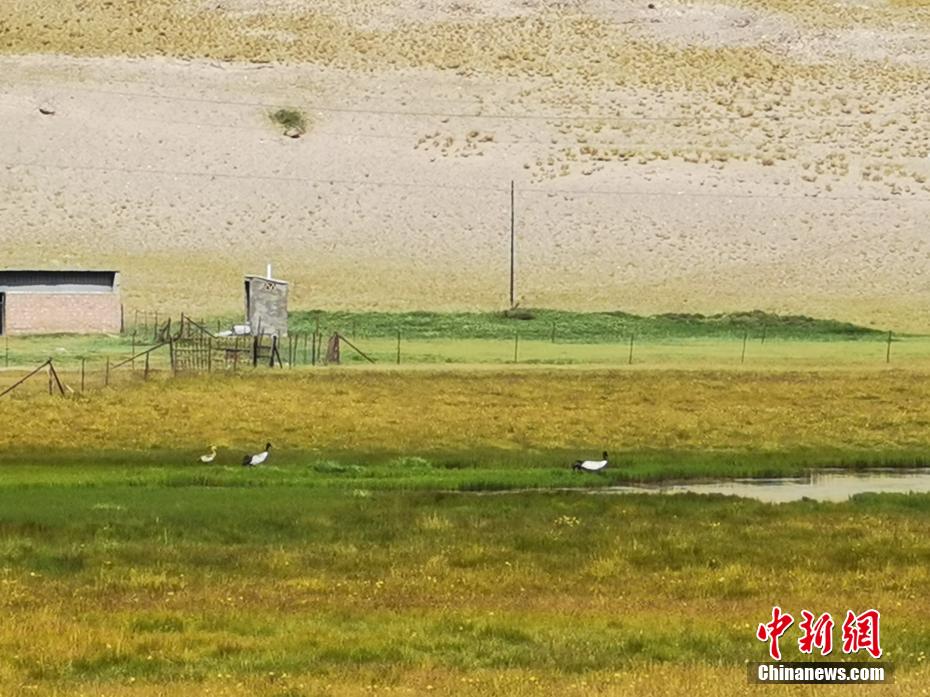 8月9日,祁連山南麓的青海省海北藏族自治州祁連縣央隆鄉(xiāng),三只黑頸鶴正在央隆濕地悠閑踱步,不時發(fā)出鳴叫聲。黑頸鶴是大型飛行涉禽,頸的上部為黑色,故稱黑頸鶴。每年,黑頸鶴在春季遷徙到繁殖地,秋季到達越冬地,是世界上唯一生長、繁殖在高原的鶴。