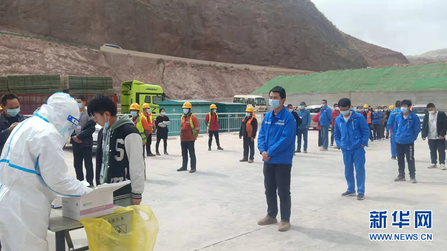 瑪爾擋水電站建設現場,施工人員排隊進行核酸檢測。新華網 劉小芳 攝
