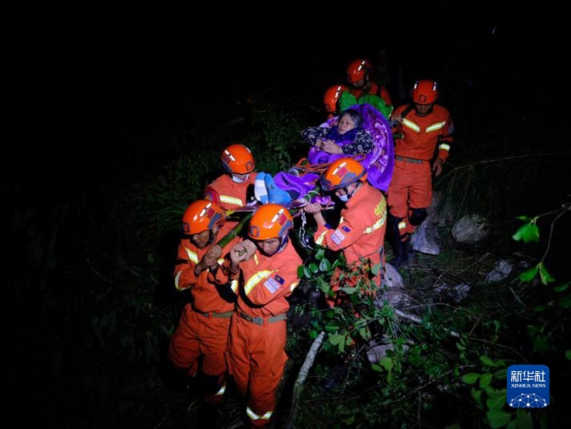 9月5日,四川省森林消防總隊甘孜支隊消防員在瀘定縣磨西鎮青崗坪村轉移群眾和傷員。程雪力 攝