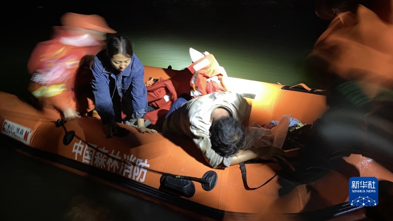 9月5日,在瀘定縣德妥鎮新華村,甘孜州森林消防支隊救援人員通過橡皮艇轉移受傷群眾。魏紅攝