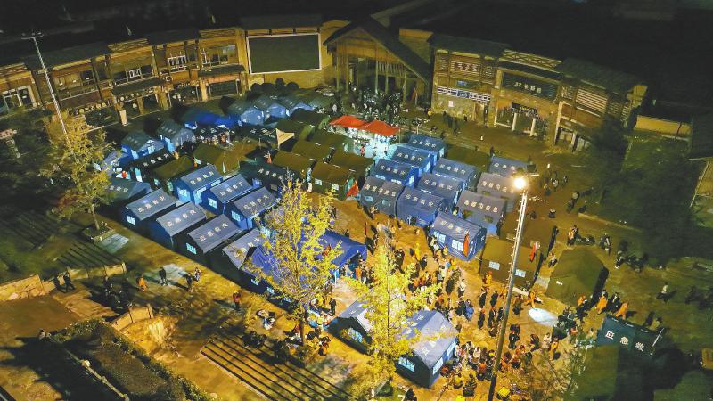 9月5日晚,瀘定縣磨西鎮貢嘎廣場的臨時安置點燈火通明。 四川日報全媒體記者 吳聃 攝