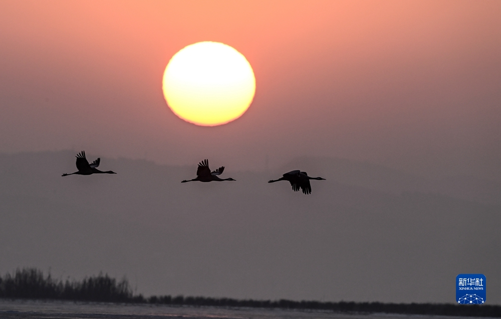 在貴州草海國家級自然保護區迎著朝陽起飛的黑頸鶴(2021年1月13日攝)。新華社記者 楊文斌 攝