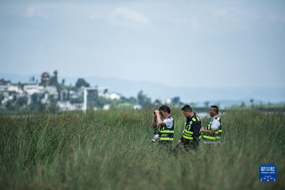 貴州草海國家級自然保護區,草海巡護隊副大隊長劉廣惠(左一)和隊員在日常工作巡護中(2021年7月8日攝)。新華社記者 陶亮 攝