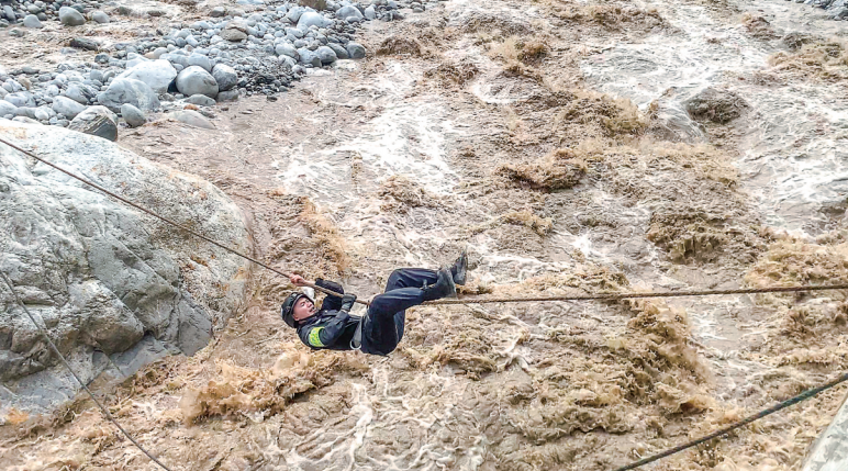 焦慮之際,另一組隊員沿河搜尋發(fā)現(xiàn)一塊離河對岸較近的巨石,率先過河的戰(zhàn)友打錨點接應,很快在兩邊架起一座“飛索橋”,曾經當過高山向導的王萬銳第一個沖上去,四肢倒掛,背對激流,飛快移向對岸。緊接著,隊員沙馬澤呷躍上飛索。鋼索和飛索兩路同時過河,隊伍很快全部來到對岸。