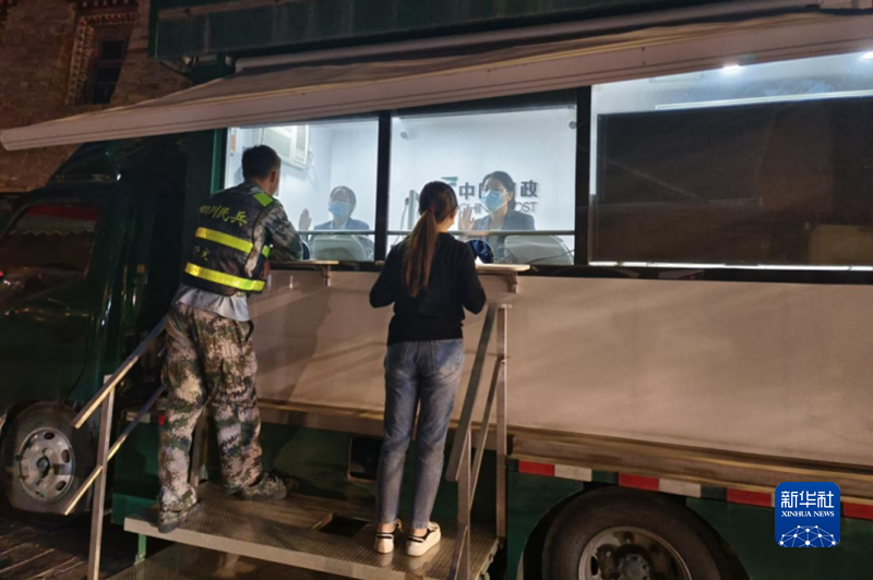 地震后第二天,郵政流動(dòng)服務(wù)車駛進(jìn)震中磨西鎮(zhèn)服務(wù)群眾。(四川郵政供圖)