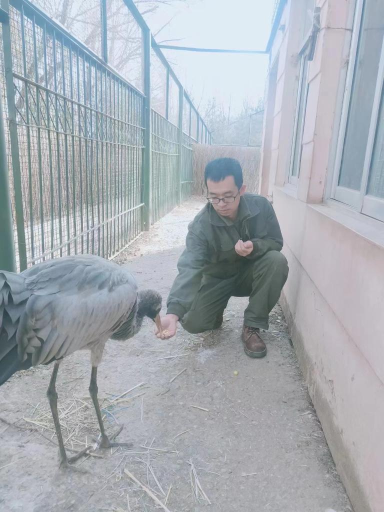 2023年2月2日,飼養員張小波正在喂養“千鶴”。(西寧野生動物園供圖)
