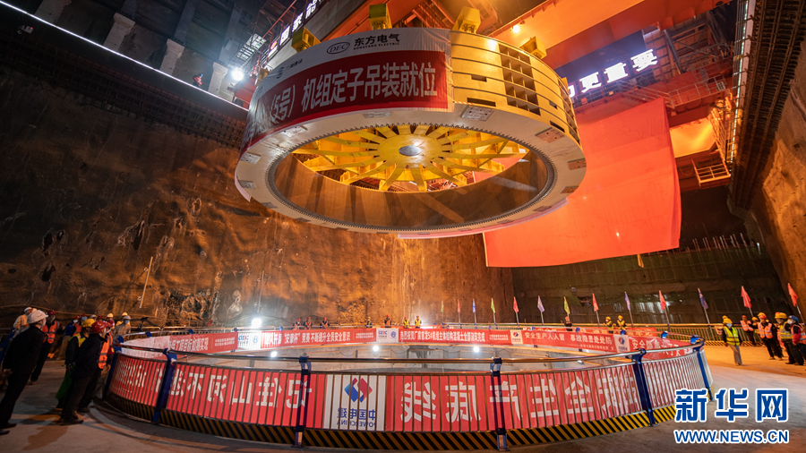 6月30日,瑪爾擋水電站地下廠房內,工作人員正在進行首臺機組定子吊裝作業。新華網 潘彬彬 攝