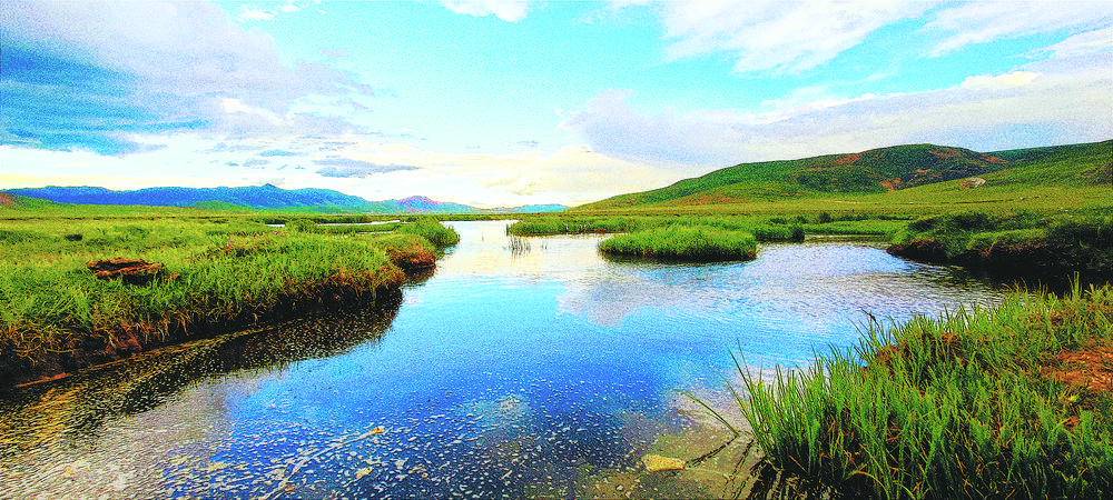藍天白云下的隆寶灘國際重要濕地寧靜而美麗。