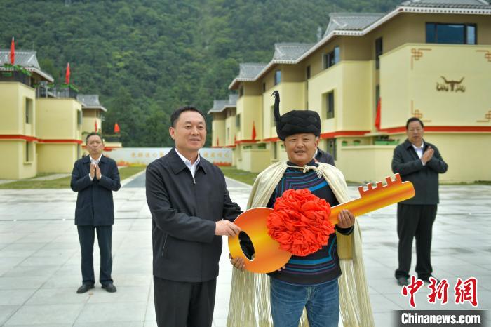 9月5日,在四川甘孜州瀘定縣磨西鎮大杉樹村(幸福新村)集中安置點,甘孜州委書記沈陽(左)向村民代表發放新房鑰匙。中新社記者 劉忠俊 攝