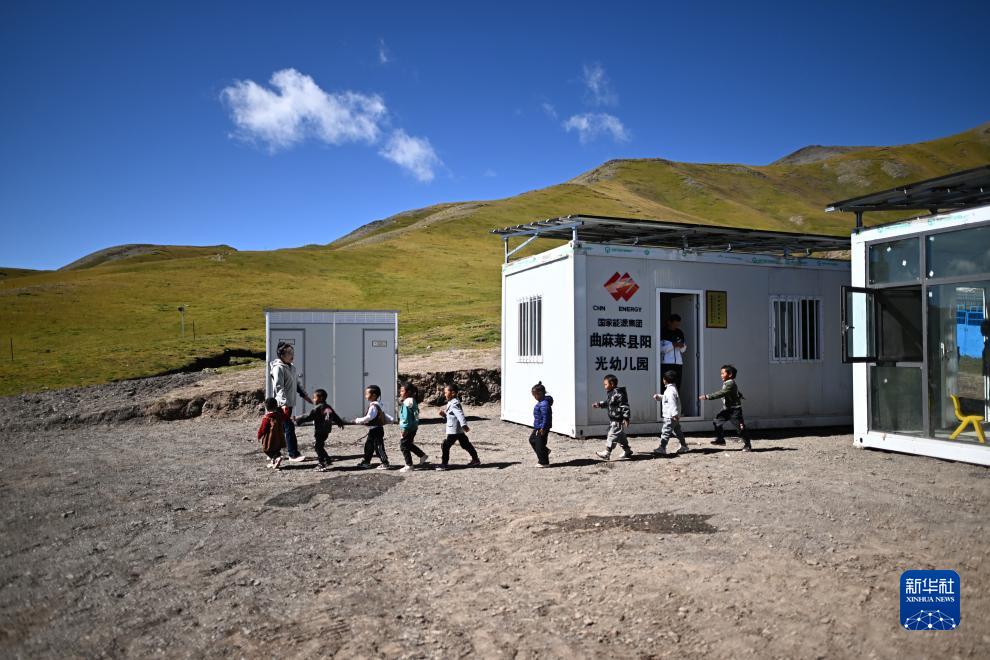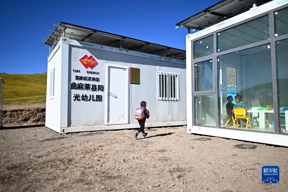 作為曲麻萊縣定點幫扶單位,國家能源集團自2022年起累計投入1350萬元,在曲麻萊縣建設15所陽光幼兒園。陽光幼兒園為集裝箱式房屋,配備屋頂離網儲能光伏系統,可以滿足供暖、照明等需求。幼兒園招收居住在周邊牧場的兒童,讓孩子們在離家不遠處就能接受學前教育。