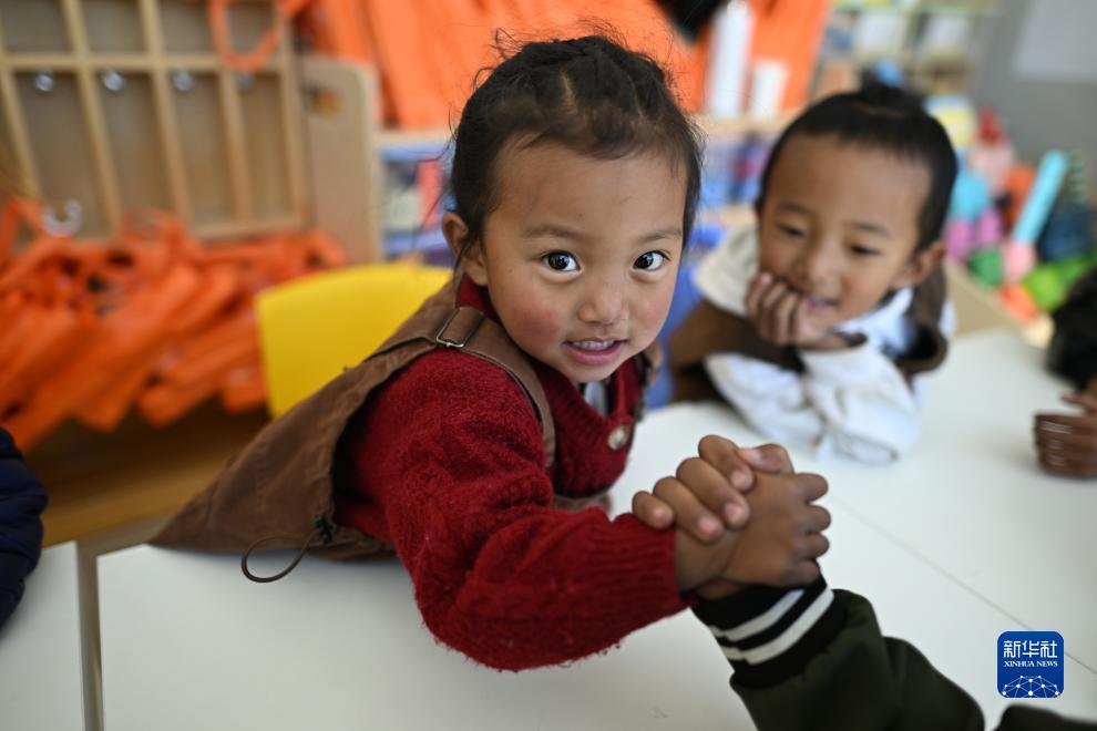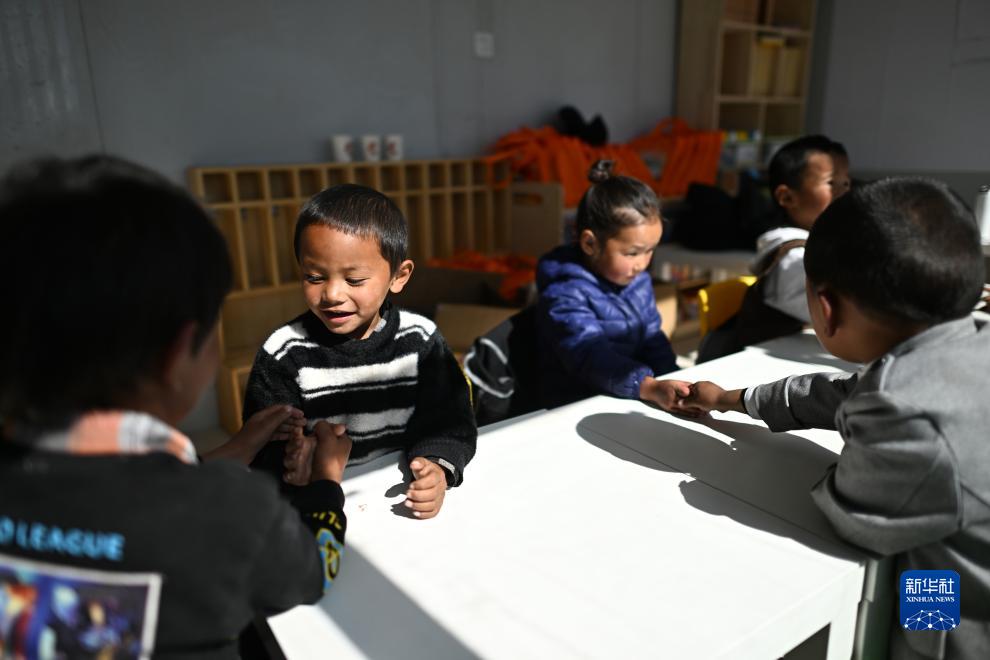 在青海省玉樹藏族自治州曲麻萊縣秋智鄉布甫村陽光幼兒園,丁增巴桑(左)和伙伴們在教室內玩耍(9月14日攝)。新華社記者 張宏祥 攝
