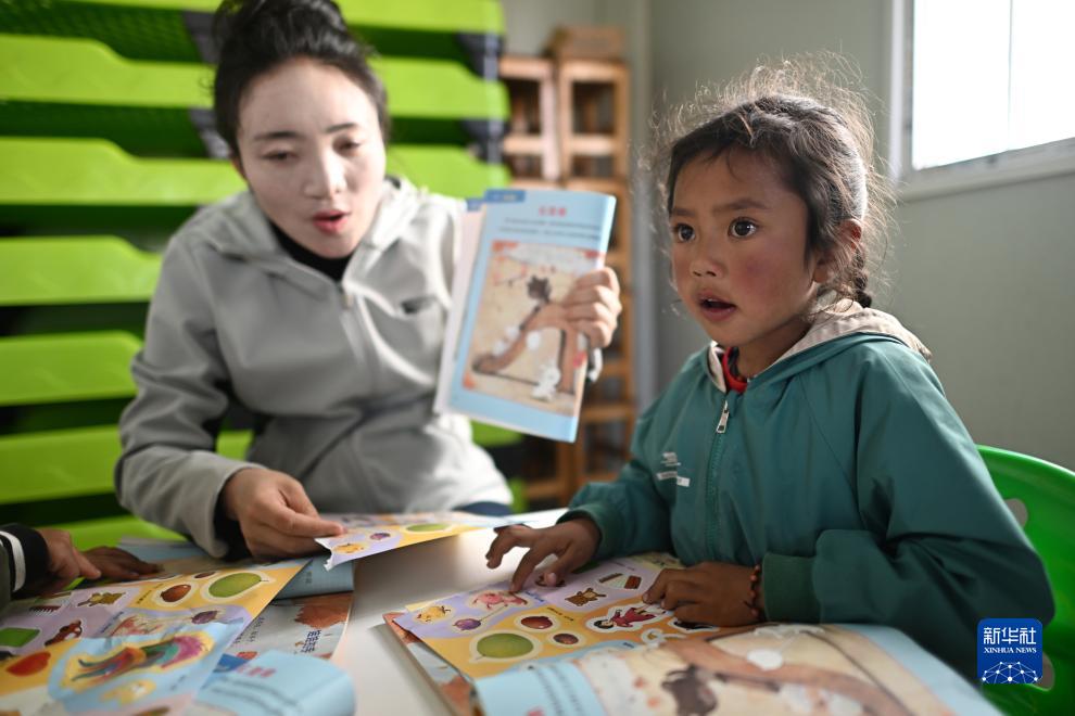 在青海省玉樹藏族自治州曲麻萊縣秋智鄉布甫村陽光幼兒園,索南卓瑪(右)在課堂上(9月14日攝)。新華社記者 張宏祥 攝