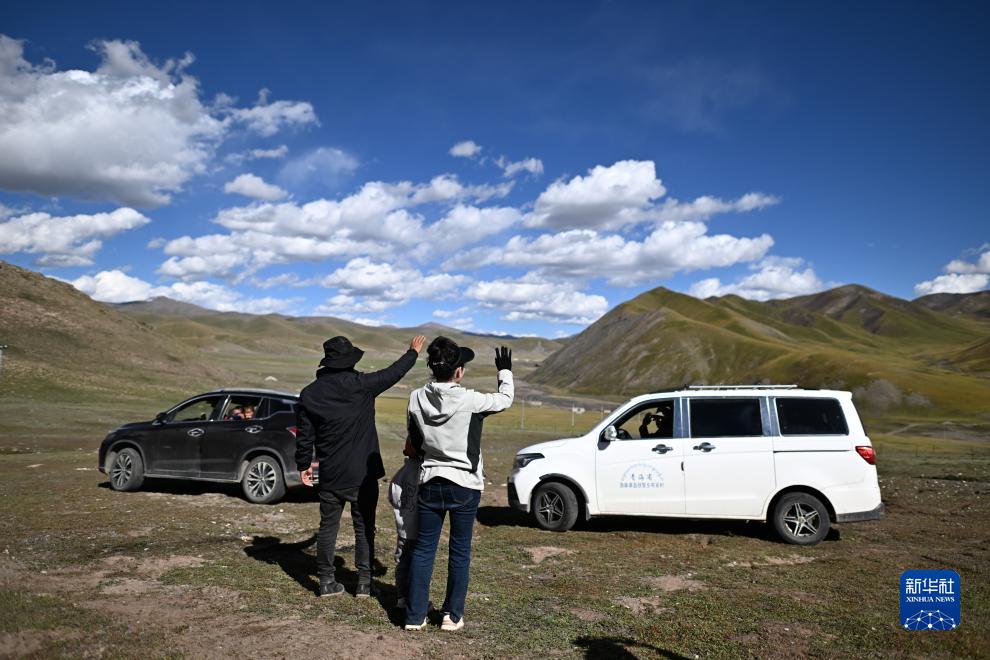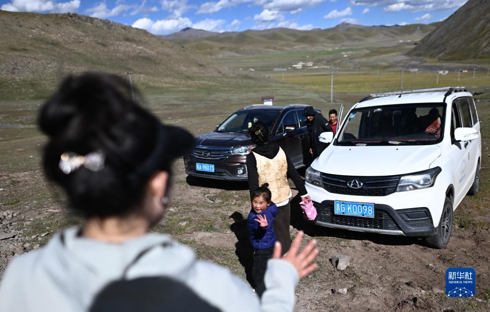 在青海省玉樹藏族自治州曲麻萊縣秋智鄉布甫村陽光幼兒園,孩子們在放學后與老師告別(9月14日攝)。新華社記者 張宏祥 攝