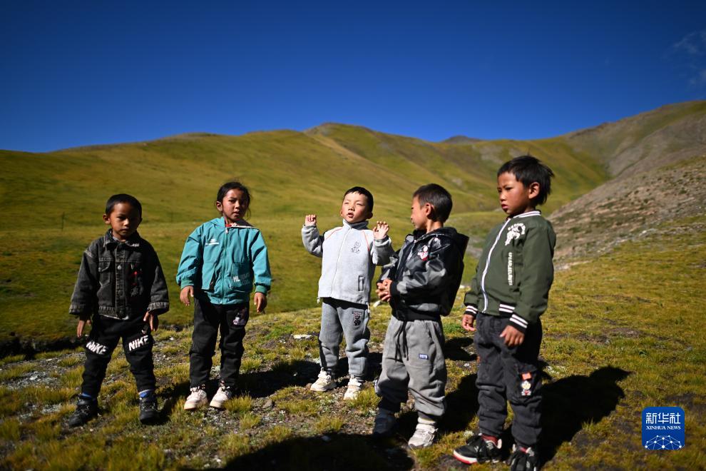 在青海省玉樹藏族自治州曲麻萊縣秋智鄉布甫村陽光幼兒園,歐周挪吾(左三)和伙伴們在教室外的草原上唱歌(9月14日攝)。新華社記者 張宏祥 攝
