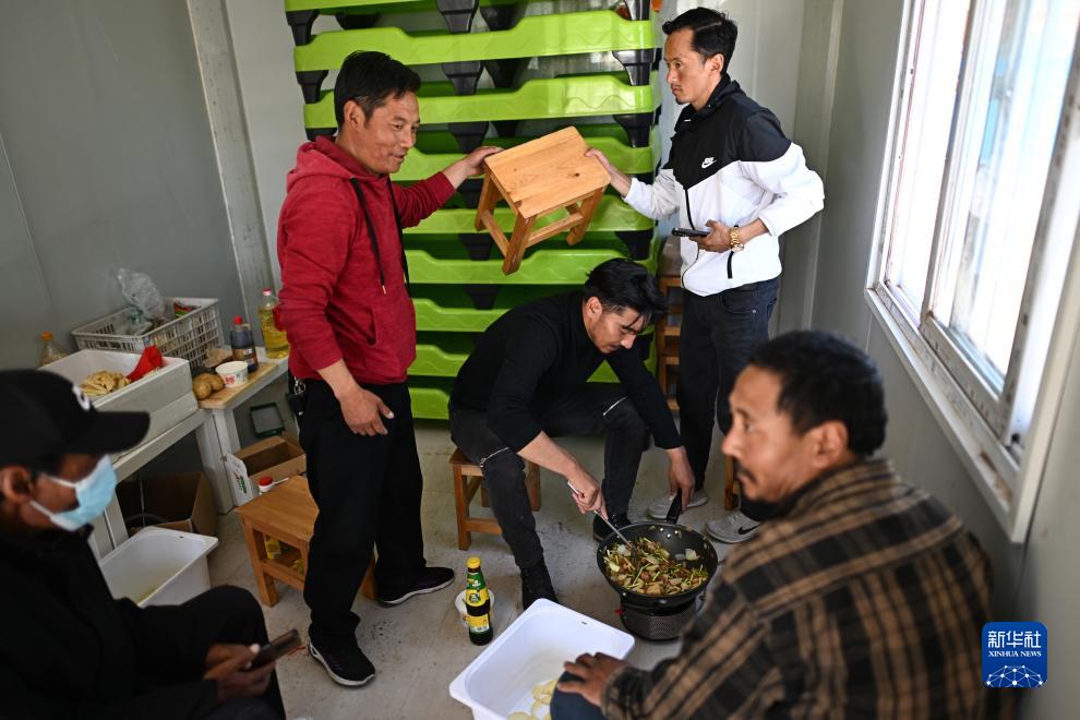 在青海省玉樹藏族自治州曲麻萊縣秋智鄉布甫村陽光幼兒園,秋智鄉幼兒園副園長才仁戰斗(左三)在板房內為孩子們準備午餐(9月14日攝)。新華社記者 張宏祥 攝