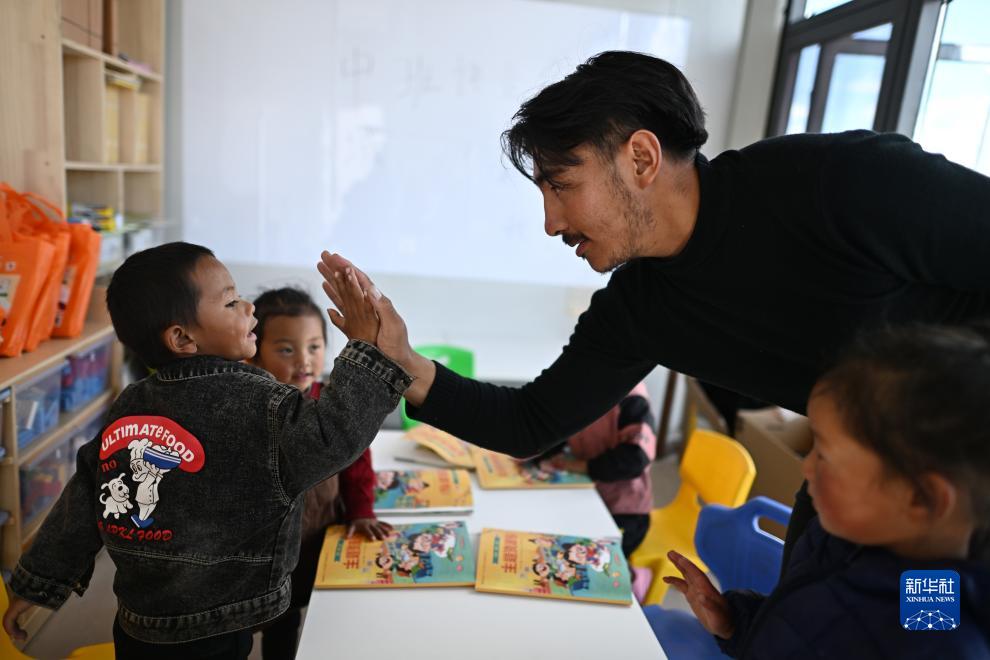 在青海省玉樹藏族自治州曲麻萊縣秋智鄉布甫村陽光幼兒園,秋智鄉幼兒園副園長才仁戰斗(右二)在課堂上和小朋友互動(9月14日攝)。新華社記者 張宏祥 攝