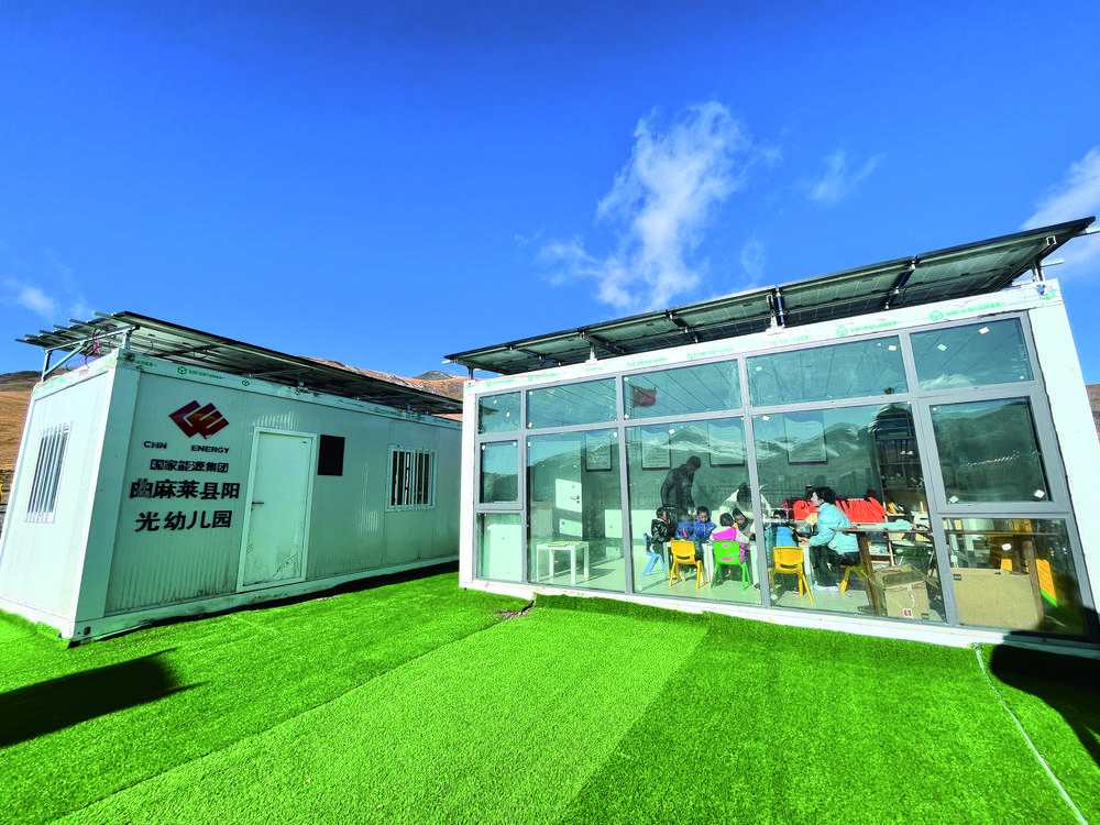 “迷你”幼兒園由兩個集裝箱組成,箱頂裝有太陽能光伏系統,可以滿足供暖、照明等需求。兩個集裝箱分別是孩子們的教室和功能室。溫暖的陽光透過一扇大大的落地窗照進教室,孩子們和老師在里面一起看書學習做游戲,雖然室外寒風凜冽,但教室內卻非常溫暖。