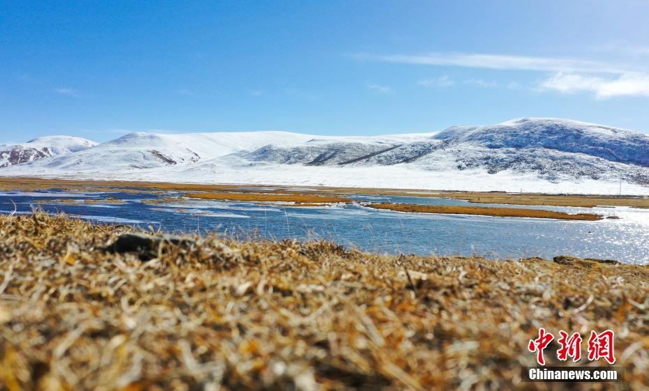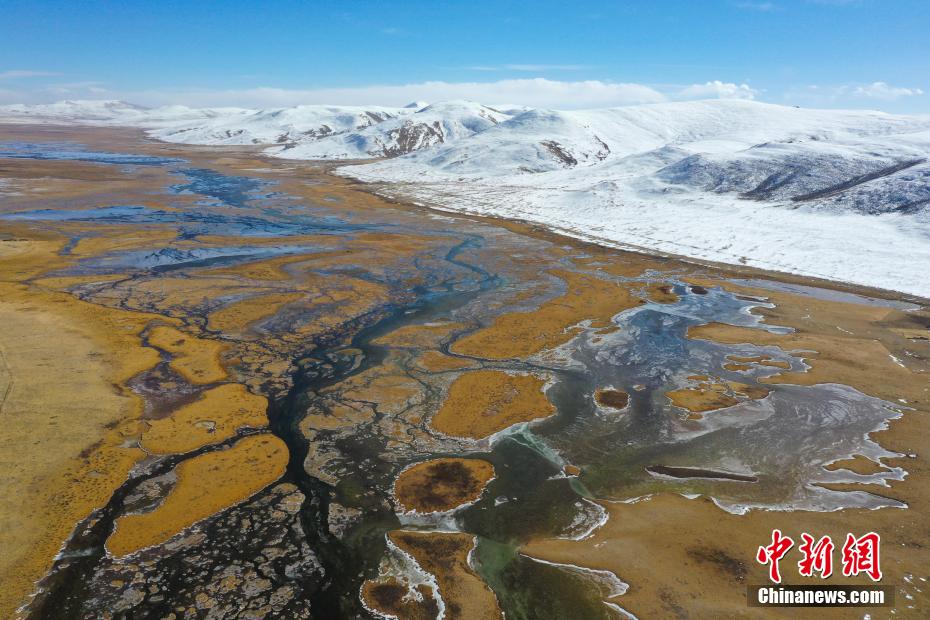 11月15日,航拍青海玉樹隆寶灘國際重要濕地冬日旖旎景色。降雪過后,位于青海省玉樹藏族自治州玉樹市境內的隆寶灘國際重要濕地連綿的山巒被白雪覆蓋,與金色的草地和蜿蜒的河流交相輝映,景色旖旎。