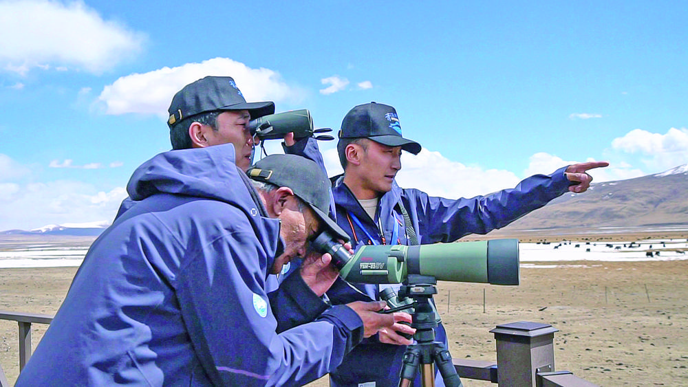 巴桑才仁和兩名濕地生態管護員調整著單筒望遠鏡的角度,找尋著“鳥中大熊貓”黑頸鶴的身影。很快,他們就輕松“鎖定”。