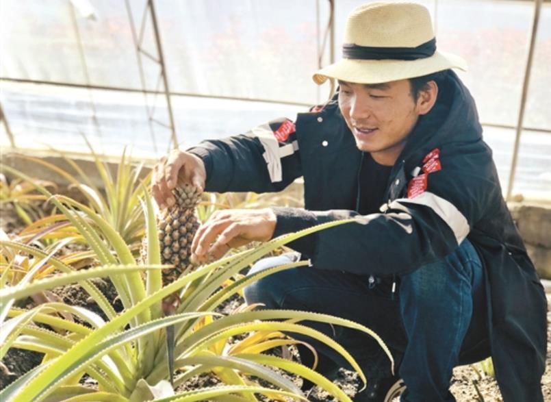 近年來,西藏拉薩曲水凈土健康產業園加大科技投入,積極引進新產品試驗試種,調整種植結構,拓寬群眾增收渠道。圖為工作人員展示園區新試種的菠蘿。記者 凃瓊攝