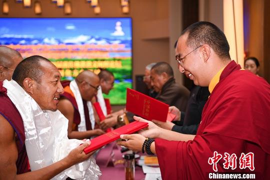 9月10日,中國佛教協會西藏分會第四屆藏傳佛教教義闡釋論壇暨堅持藏傳佛教中國化方向研討會在日喀則市舉行。圖為全國政協常委、中國佛協副會長、中國佛協西藏分會會長班禪額爾德尼·確吉杰布(右)為優秀闡釋論文作者頒獎。中新社記者 何蓬磊 攝