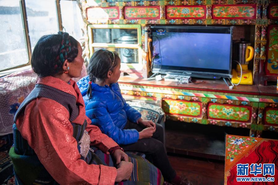 西藏日喀則市定日縣扎西宗鄉托桑林村村民格桑(左)和女兒在看電視(2020年1月20日攝)。 新華社記者孫非 攝