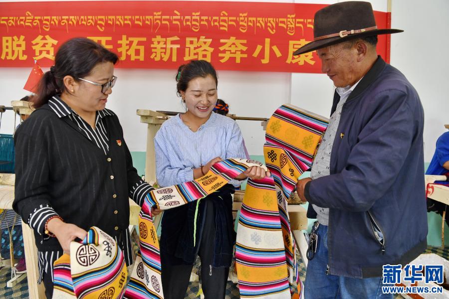 2020年7月6日,西藏扎囊縣吉汝鄉扎西林村駐村工作隊隊長央珍(左)、黨支部書記旺扎(右)和專業合作社社員次旺曲珍查看民族手工業(邦典)質量。 新華社記者 張汝鋒 攝
