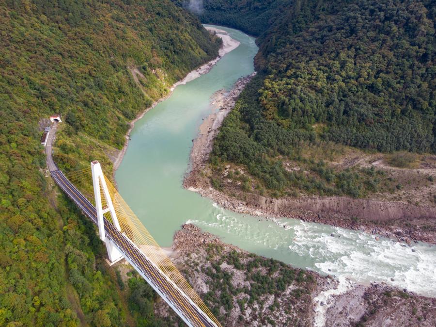 川藏公路通麥路段上的迫龍溝特大橋(2019年10月27日攝,無人機(jī)照片)。新華社記者 孫非 攝