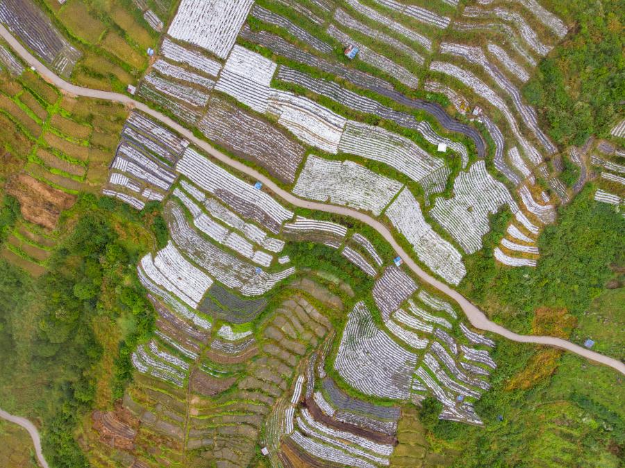 這是穿過西藏墨脫縣郊農(nóng)田的一條農(nóng)村公路(2019年10月26日攝,無人機(jī)照片)。新華社記者 孫非 攝