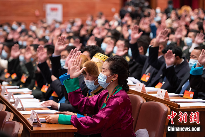 1月24日,西藏自治區第十一屆人民代表大會第四次會議上代表們舉手表決《西藏自治區國家生態文明高地建設條例(草案)》。中新社記者 何蓬磊 攝