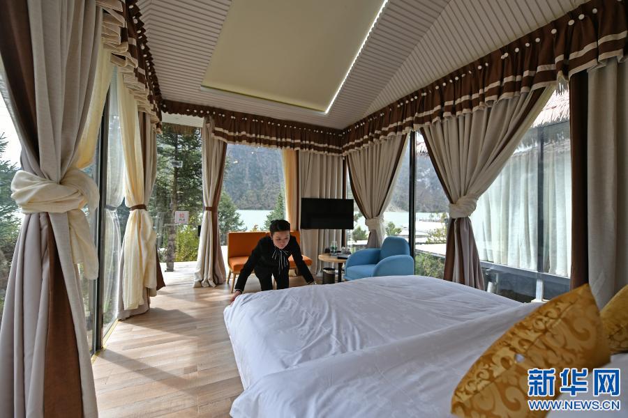 然烏國際自駕·房車露營營地是西藏昌都市八宿縣招商引資的旅游產業扶貧項目,2018年3月正式營業。圖為一名營地工作人員在湖邊的星空房內整理房間(2019年5月24日攝)。新華社記者 李鑫 攝