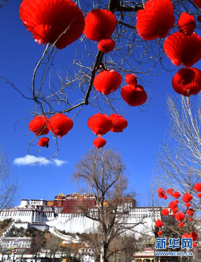 2月8日拍攝的布達拉宮前的大紅燈籠。新華社記者 覺果 攝