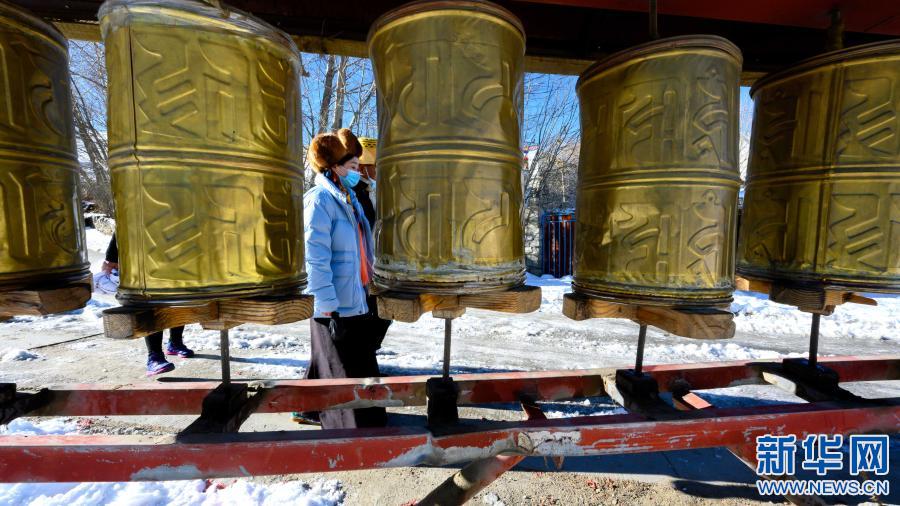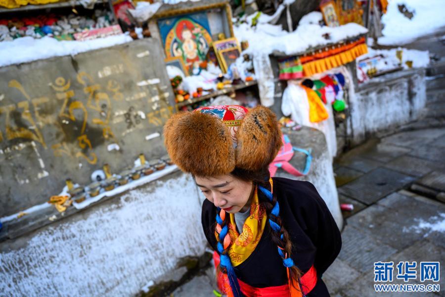 2月12日,在西藏自治區(qū)山南市乃東區(qū)澤當鎮(zhèn),格央和父母一起,在藏歷新年第一天轉(zhuǎn)山祈福。這是格央在等待取“吉祥水”。新華社記者 劉金海 攝