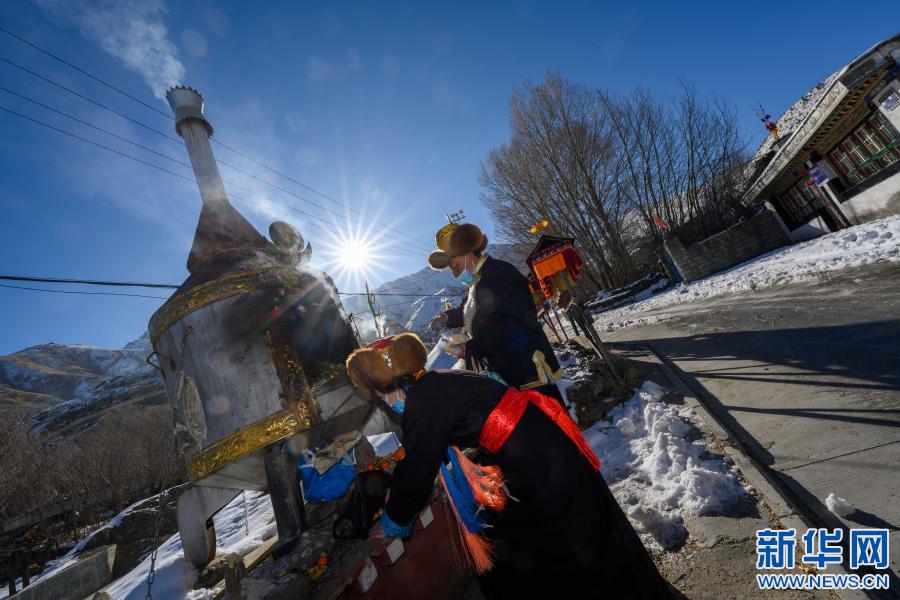 2月12日,在西藏自治區(qū)山南市乃東區(qū)澤當鎮(zhèn),格央和父母一起,在藏歷新年第一天轉(zhuǎn)山祈福。這是格央(前)和父親一起煨桑。新華社記者 劉金海 攝