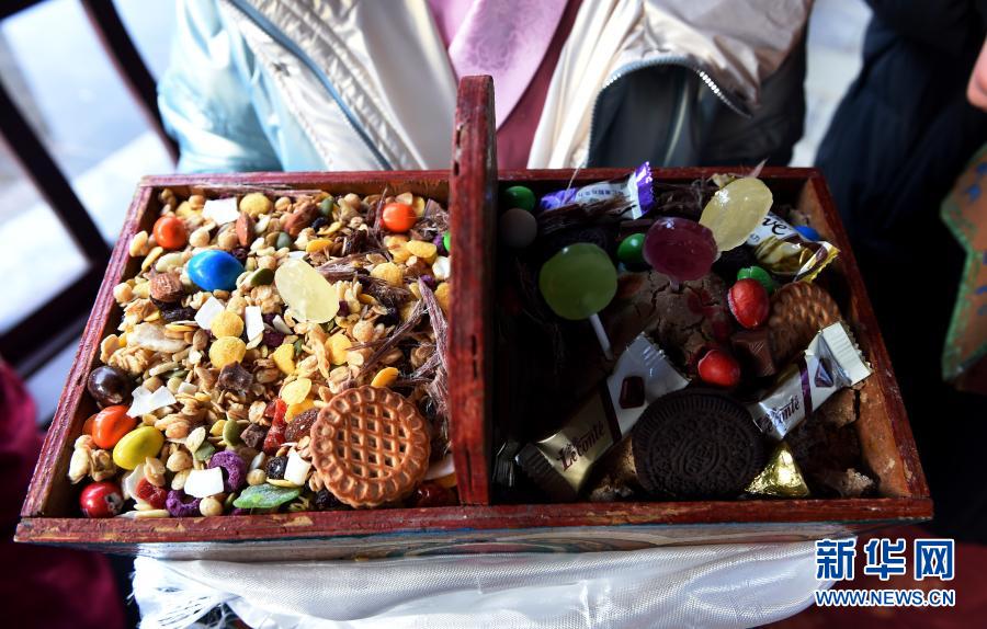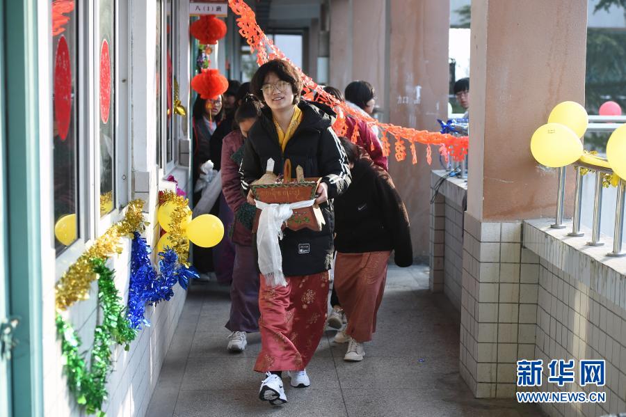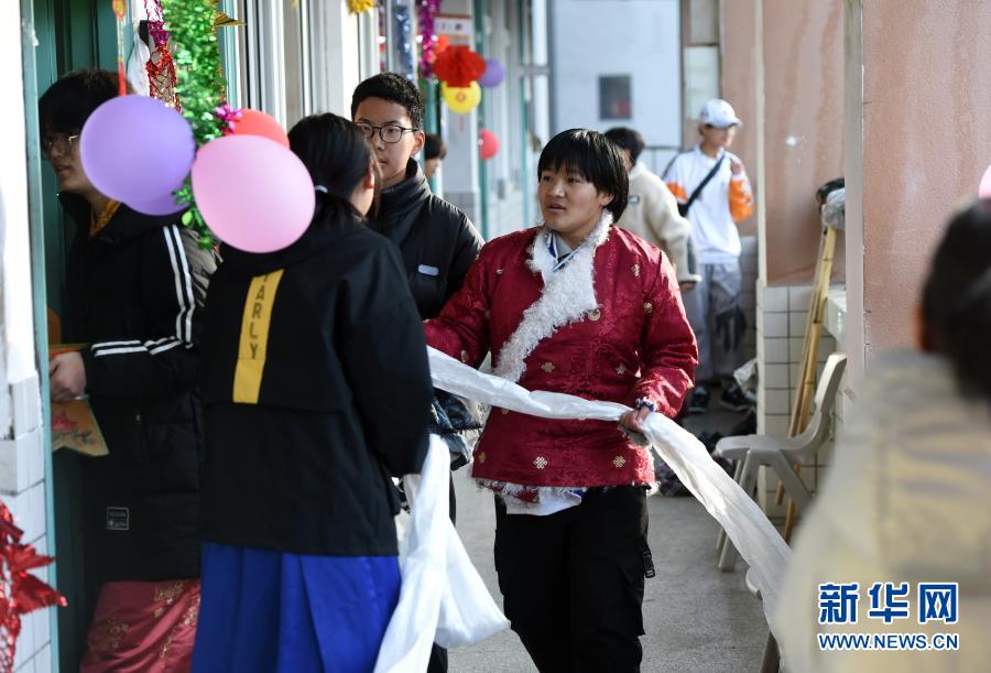2月12日,合肥市第三十五中學西藏班的學生手捧祈福用的切瑪盒行走在校園內(nèi),給老師同學們拜年。新華社記者 周牧 攝