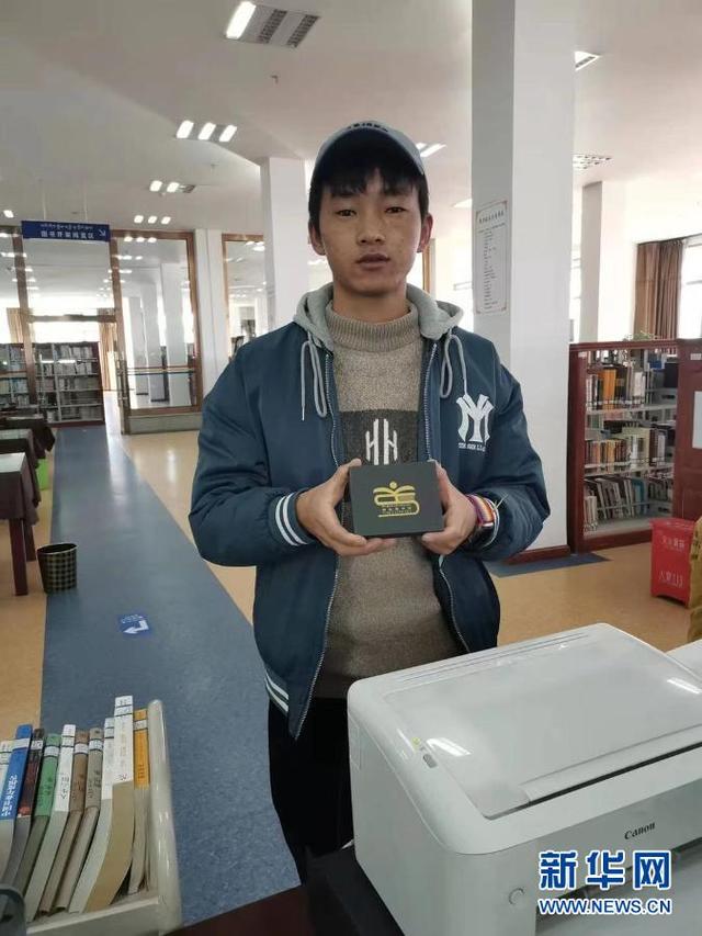 讀者在西藏自治區圖書館參加藏漢雙語閱讀平臺相關活動后,展示內存有電子書、非物質文化遺產傳承人紀錄片等內容的“數字資源寶”優盤獎品(資料照片)。新華社發(西藏自治區圖書館供圖)