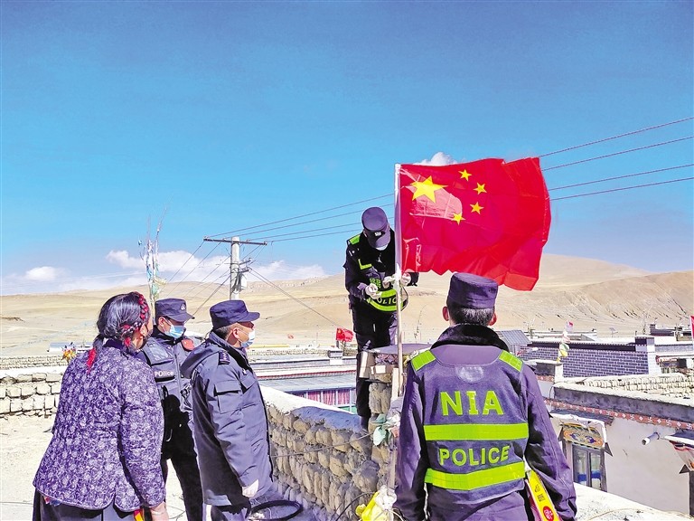 圖為崗巴縣移民警察與當(dāng)?shù)厝罕娨黄饸g度“雙節(jié)”,一起更換屋頂五星紅旗。扎西頓珠 攝