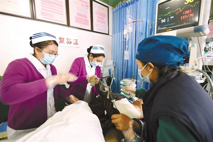 圖為拉薩市人民醫院醫護人員為前來就診的患者服務