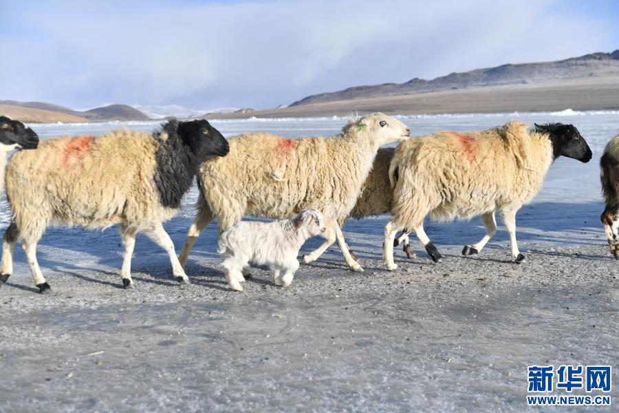 牧羊人扎西引導頭羊來到湖邊。他抱起一只小羊,向冰面踏出第一步,隨即羊群緩慢跟進。