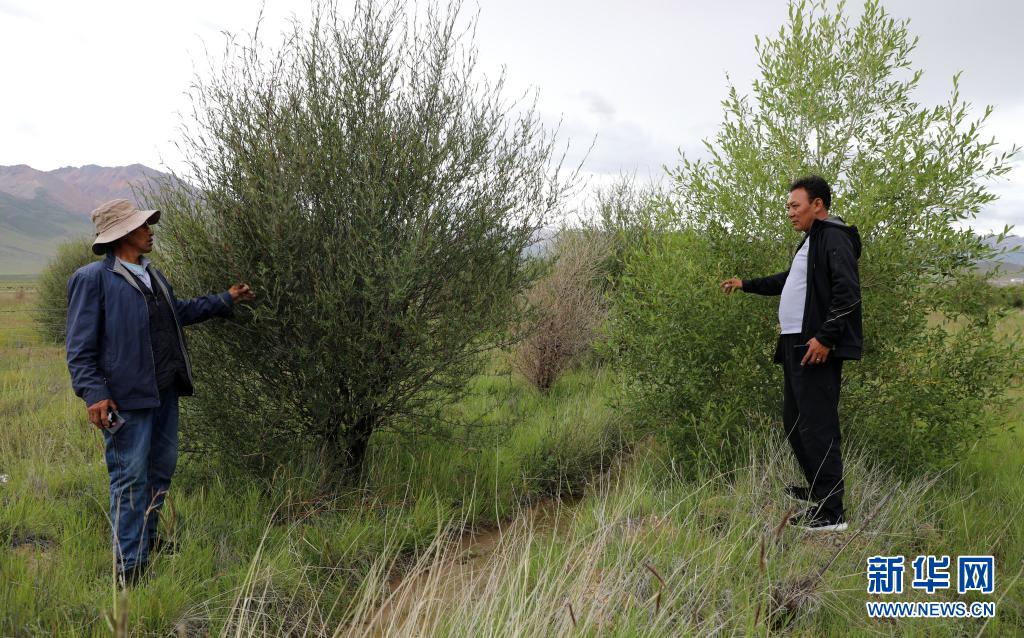 索朗羅布(右)在檢查樹的長勢(shì)(2020年8月8日攝)。新華社記者 覺果 攝