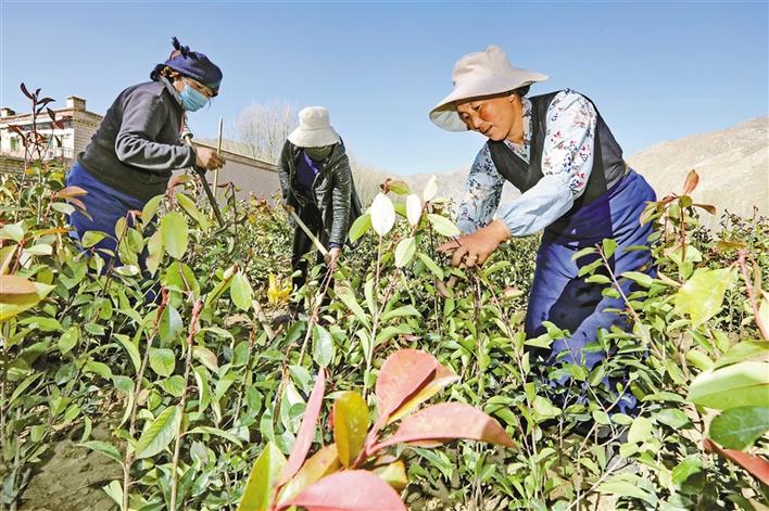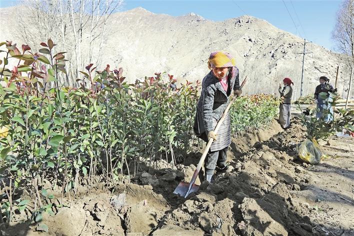 圖為拉薩市曲水縣才納鄉納木村村民正在房前屋后種植樹苗。