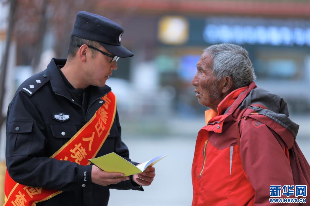 吉隆出入境邊防檢查站警察向駐地邊民普及反恐怖主義法相關知識。(新華社發 肖富貴 攝)