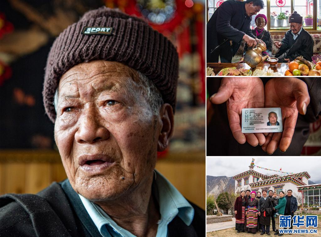 這是一張拼版照片,左圖為達確的肖像(1月14日新華社記者普布扎西攝);右上圖為家人給達確老人唱歌敬酒(1月14日新華社記者普布扎西攝);右中圖為達確的身份證(1月14日新華社記者晉美多吉攝);右下圖為達確(中)一家人的合影(1月14日新華社記者晉美多吉攝)。新華社發
