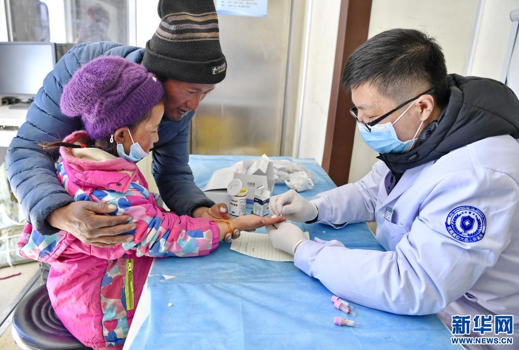 4月20日,在巡診車(chē)上,山東省煙臺(tái)市第五批援藏醫(yī)療隊(duì)醫(yī)生焦有誠(chéng)(右)為亞來(lái)鄉(xiāng)歐熱村村民采血檢驗(yàn)。新華社記者 張汝鋒 攝