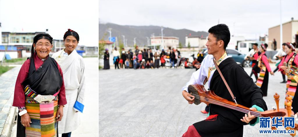 拼版照片:左圖為西藏日喀則市拉孜縣查務鄉明瑪村村民倉瓊(左)和兒子群培次仁;右圖為拉孜縣民間藝術團在明瑪村易地搬遷點為村民表演(2020年8月2日攝)。新華社記者 詹彥 攝