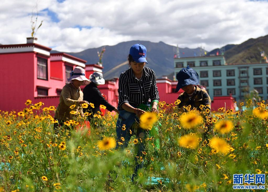 西藏拉薩市曲水縣四季吉祥村村民在采摘雪菊(2017年9月27日攝)。新華社記者 晉美多吉 攝
