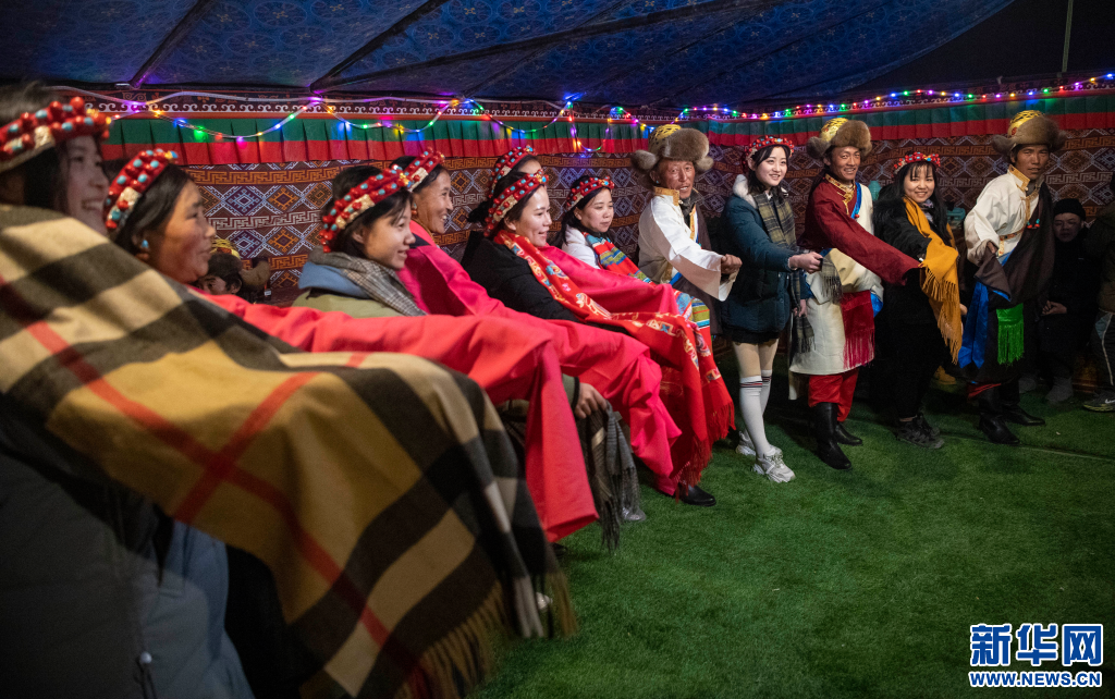 西藏日喀則市扎西宗鄉巴松村發展旅游產業,當地農牧民和游客一起跳起民族舞蹈(2020年1月20日攝)。新華社記者 孫非 攝