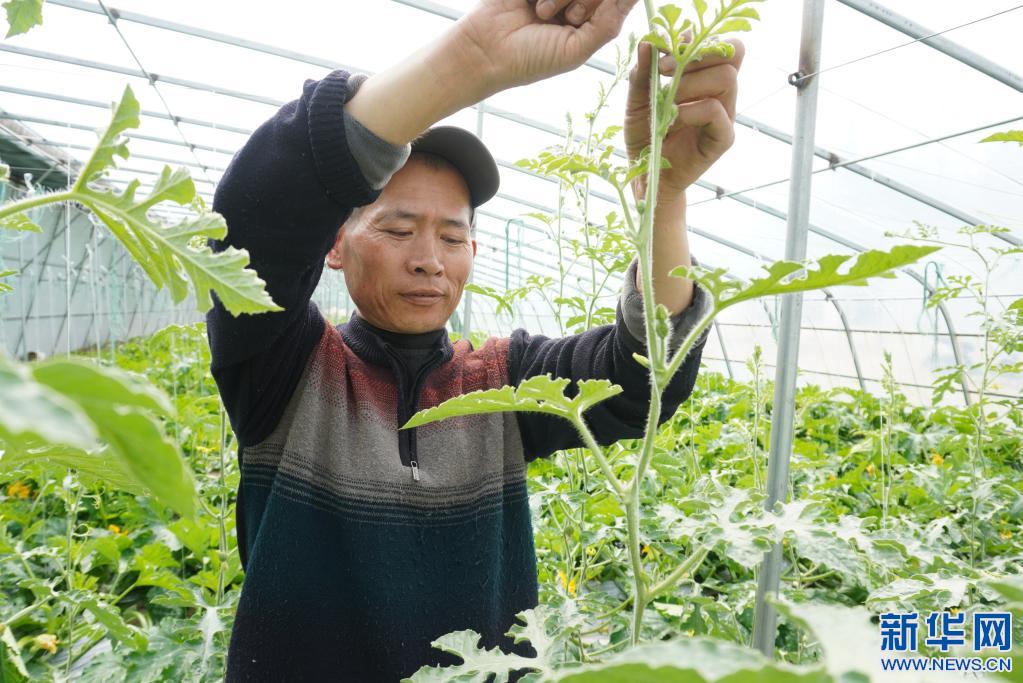 西藏曲水縣南木鄉江村村民李守遠正在給蔬菜授粉(2021年3月30日攝)。 新華社記者 王澤昊 攝