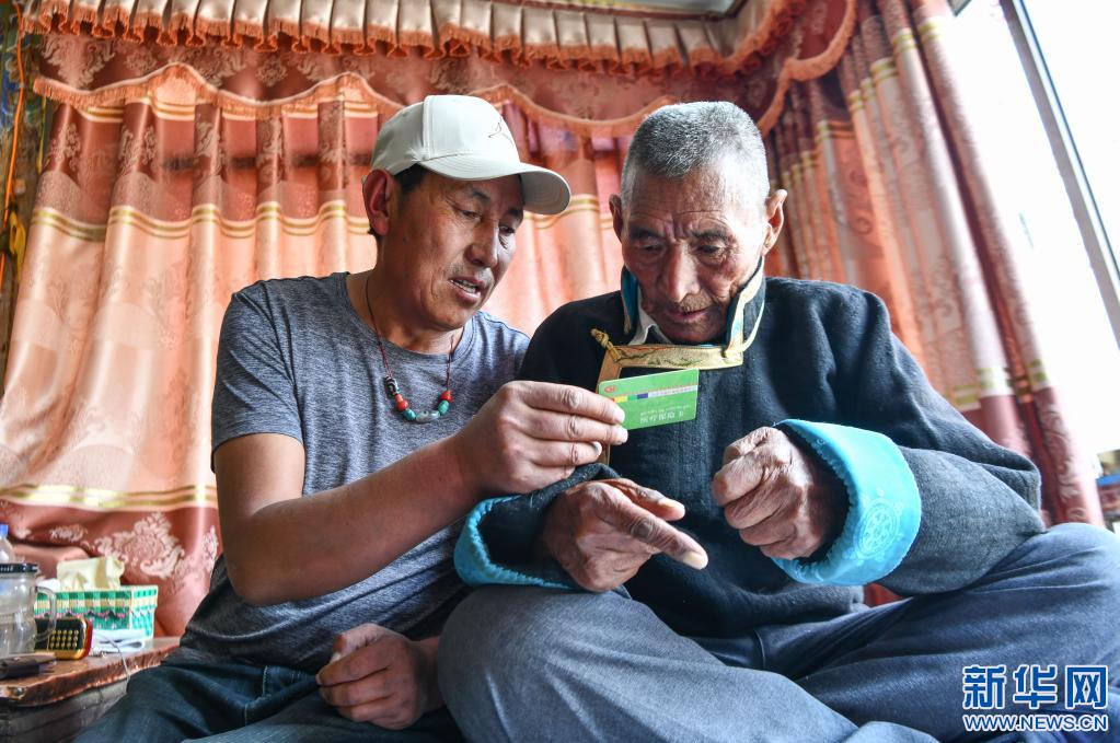 拉布的兒子(左)在向老人介紹醫??ǖ那闆r(4月25日攝)。新華社記者 晉美多吉 攝