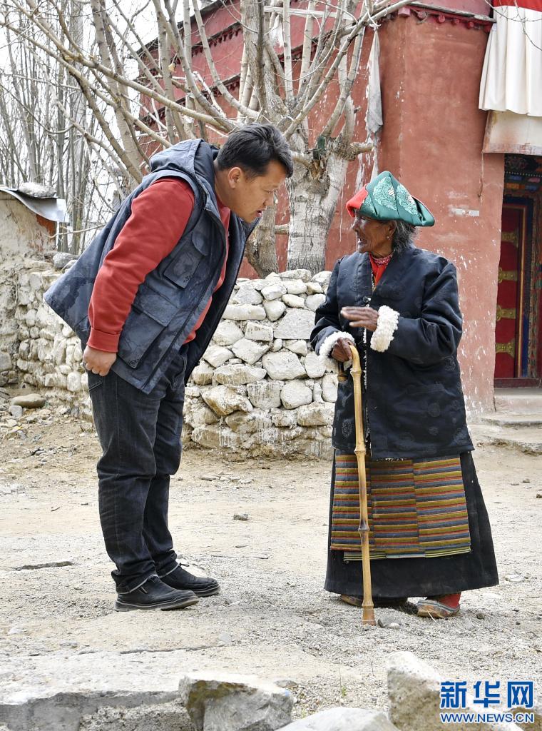 拉確老人(右)和來走訪的鄉干部嘮家常(4月16日攝)。新華社記者 張汝鋒 攝